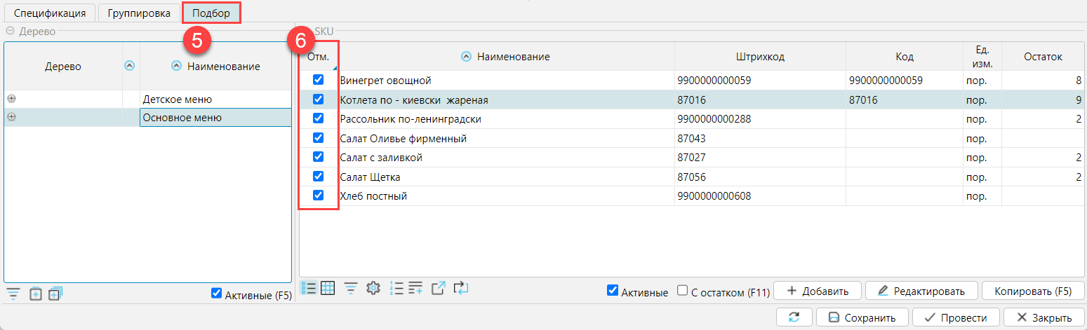 • отметить товары, которые должны быть включены в меню. Используйте навигацию по группам меню в блоке Дерево, чтобы отметить все необходимые товары.