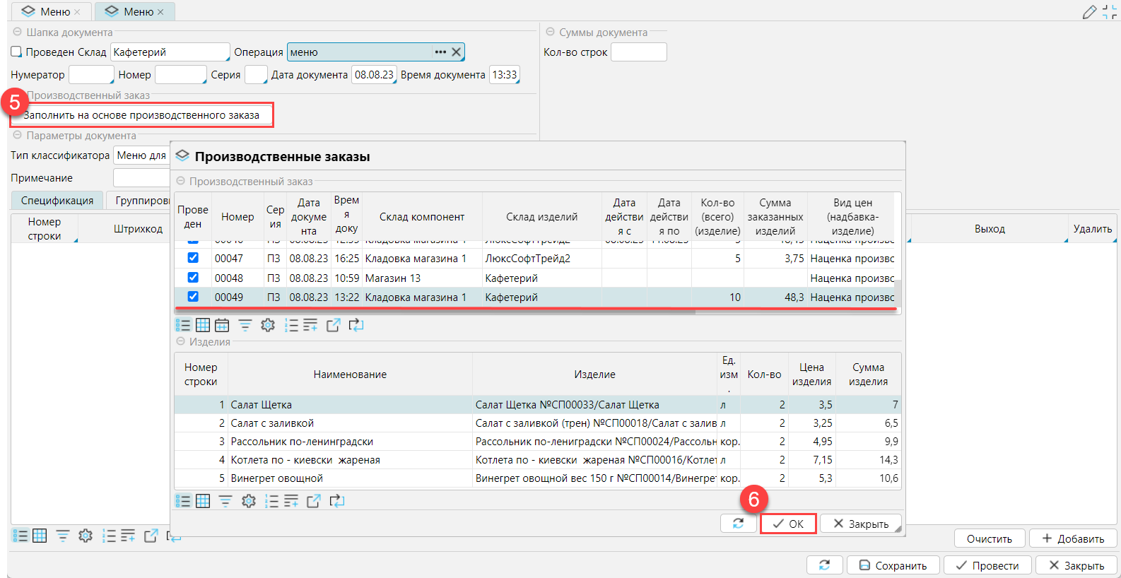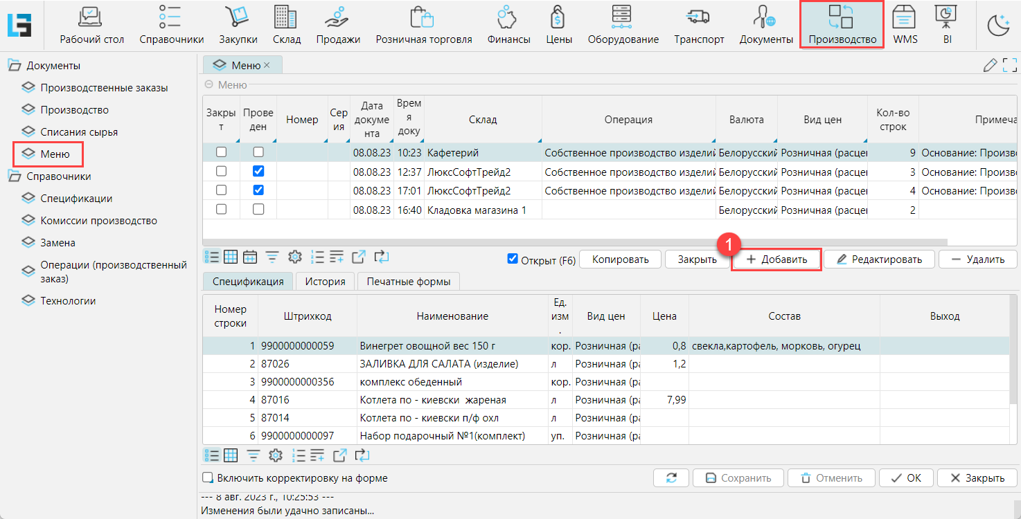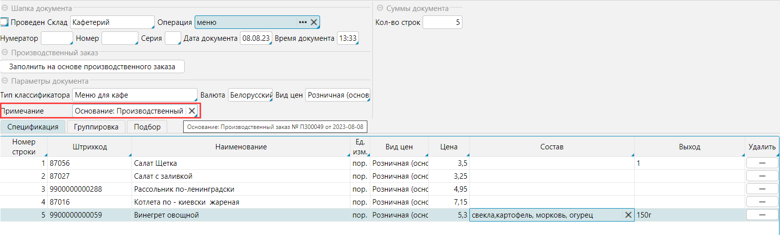 Спецификация документа меню - это блюда, которые включены в меню. Спецификацию можно заполнить с помощью подбора блюд или в соответствии с производственным заказом.
