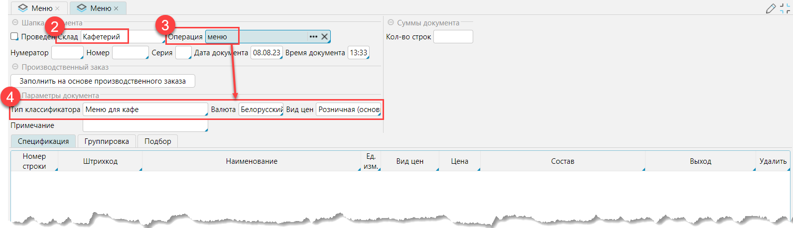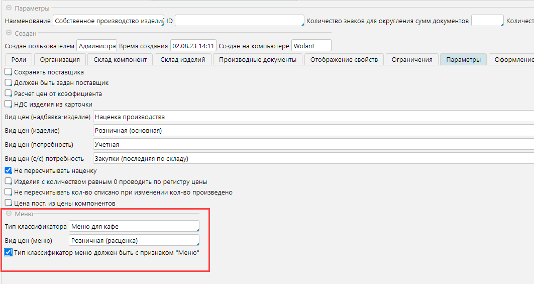 Для документа меню нужно задать операцию.  Для меню можно создать отдельную производственную операцию, или задавать настройки меню в уже существующих операциях: на вкладке Параметры в блоке Меню нужно указать параметры меню, которые будут использованы для его формирования: