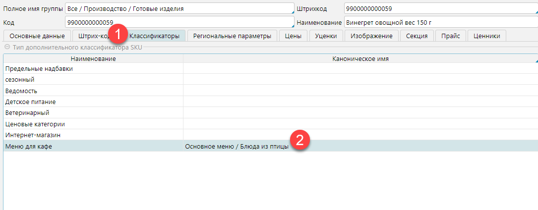 -  если товарные группы основного классификатора не соответствуют группам классификатора меню, то в карточках товаров-изделий на вкладке Классификаторы указать соответствующую группу классификатора меню