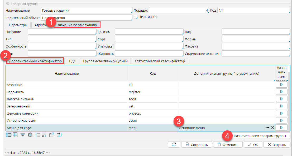 -  если товарные группы основного классификатора соответствуют группам классификатора меню, то в настройке товарной группы на вкладке Значения по умолчанию - Дополнительный классификатор указать соответствующую группу классификатора меню и нажать Назначить всем товарам группы