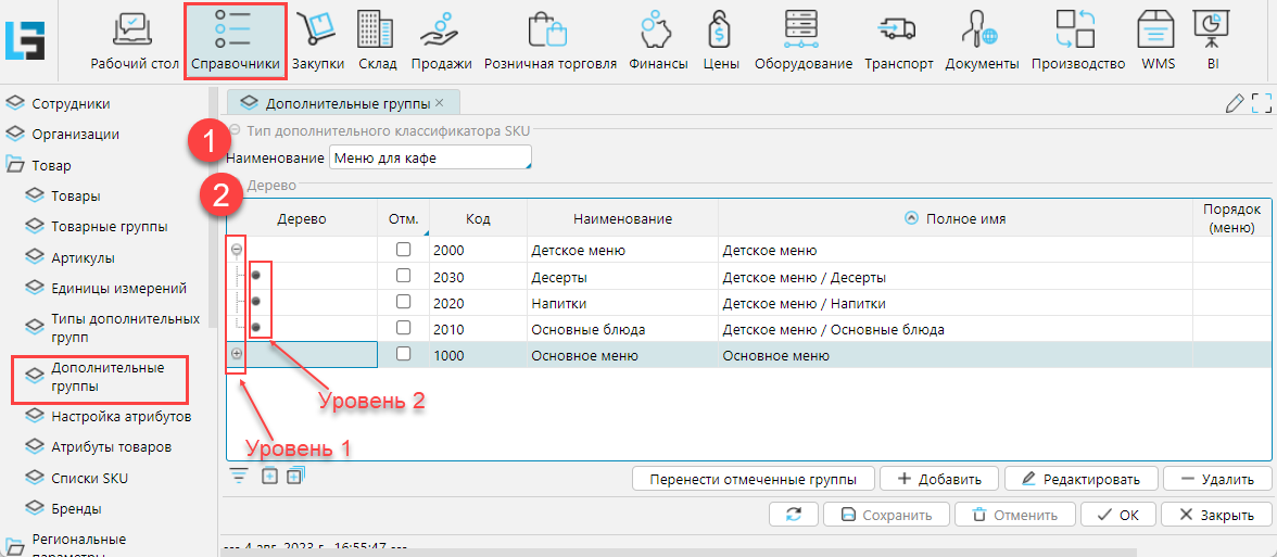 • Добавить группы классификатора, которые будут соответствовать разделам меню.  Глубина иерархии не должна превышать 2-х уровней. Условно можно сказать, что группы первого уровня - это виды меню, например, основное/детское/банкетное/винная карта и т.п., а группы второго уровня - это разделы меню, например, супы/вторые блюда/гарниры/напитки/десерты/ и т.п., либо группы первого уровня - это разделы меню, а группы второго уровня - подразделы.