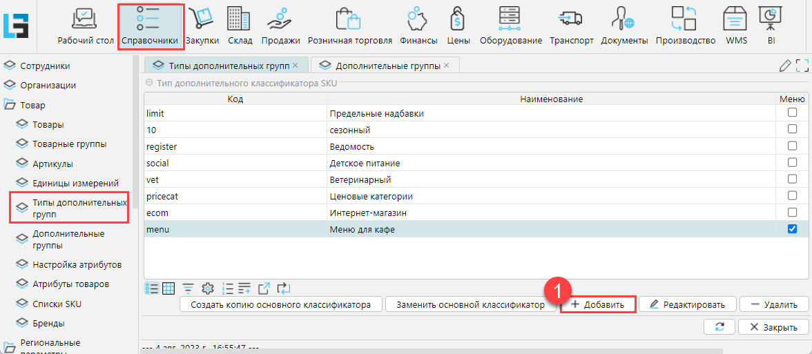 • На форме Справочники - Типы дополнительных  групп добавить классификатор для меню. В настройках классификатора отметить признак Меню