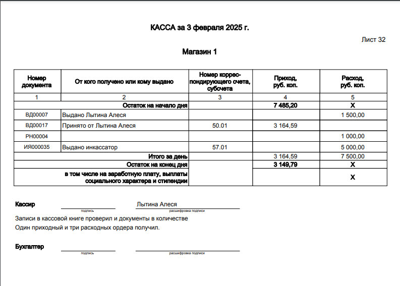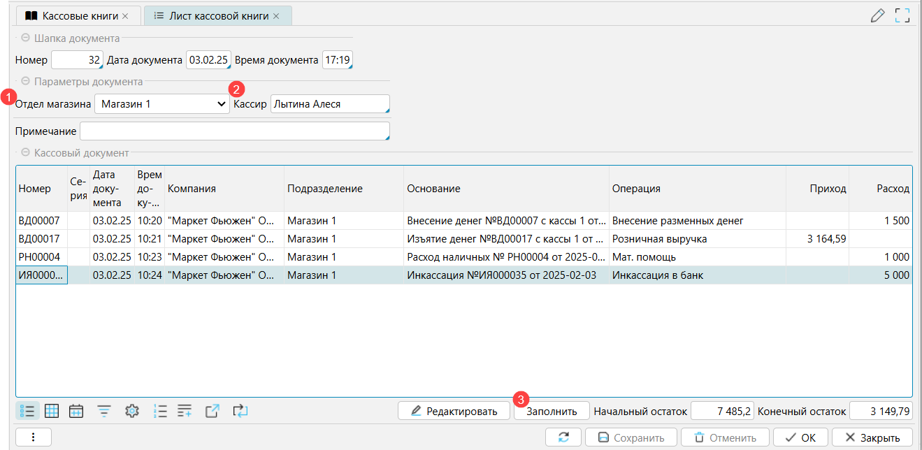 Для формирования листа кассовой книги нужно указать Отдел магазина, Кассира и нажать кнопку Заполнить. Дата автоматически указывается текущая. Программа заполнит все кассовые операции за указанную дату, отобразит Начальный и Конечный остаток средств в центральной кассе.