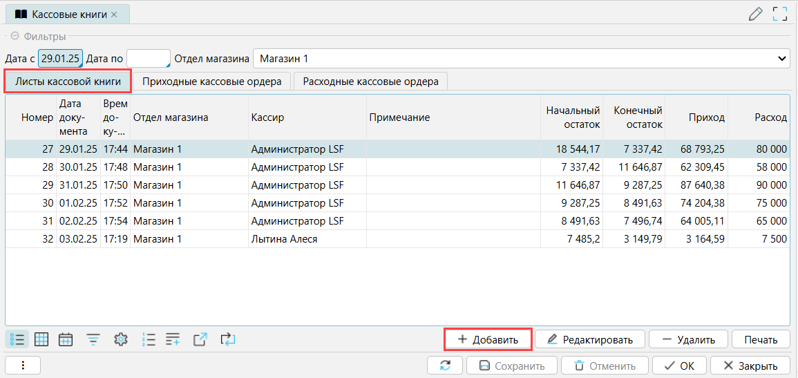 Лист кассовой книги - это отчет по всем кассовым операциям кассира за день. Они отображаются на вкладке Листы кассовой книги формы Рабочий стол - **Кассовые книги **(рис. 1). Здесь же формируются новые листы и можно редактировать существующие.  По кнопке Печать формируется печатная форма выделенного листа кассовой книги (рис. 2)