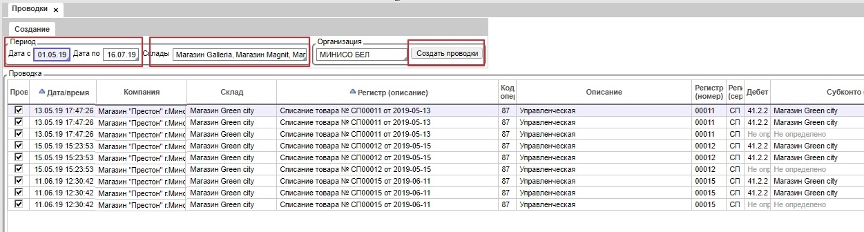 Для их формирования необходимо задать период, выбрать склады и нажать кнопку «Создать проводки».