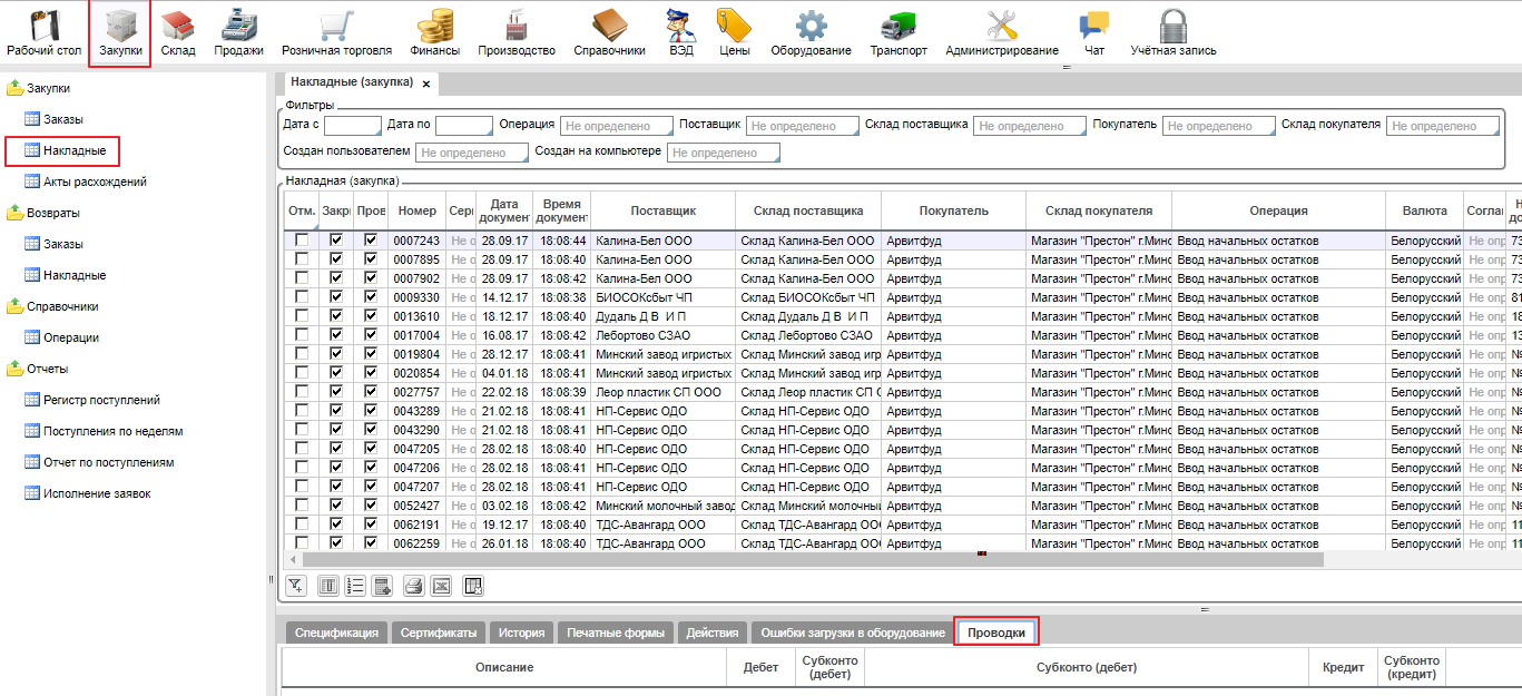 Проводки по каждому конкретному документу товародвижения отображаются в закладке «Проводки» в форме документов соответствующего типа. Например, для приходных накладных в закладке «Проводки» формы Закупки - Закупки -Накладные.