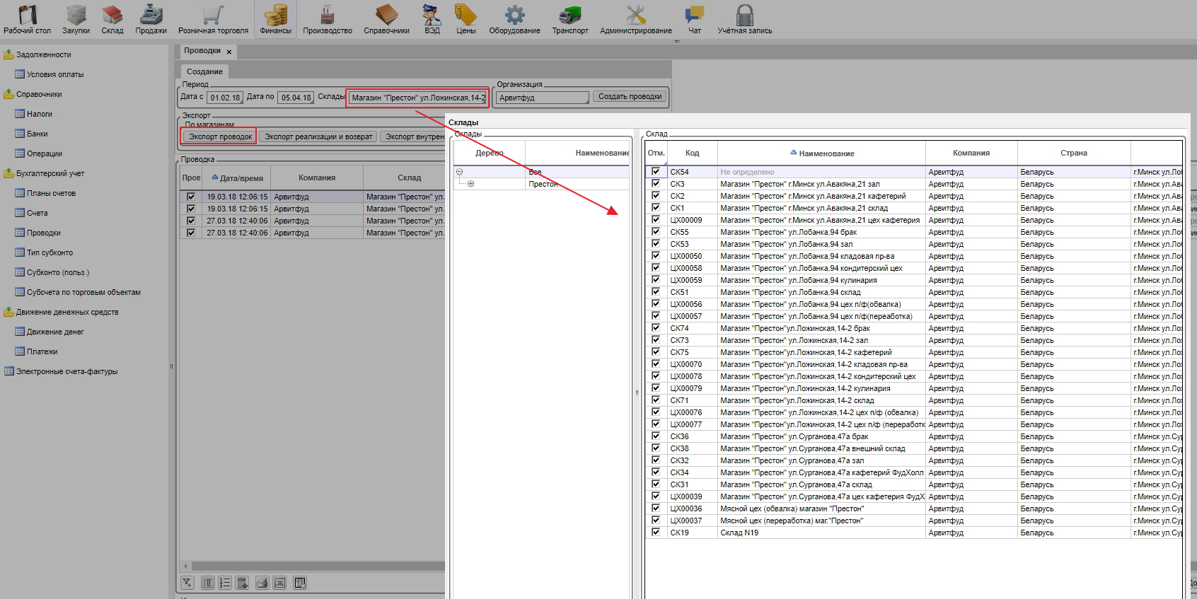 - В форме, вызываемой по полю «Склады», отметить склады (отделы магазинов), по которым необходимо выгрузить проводки