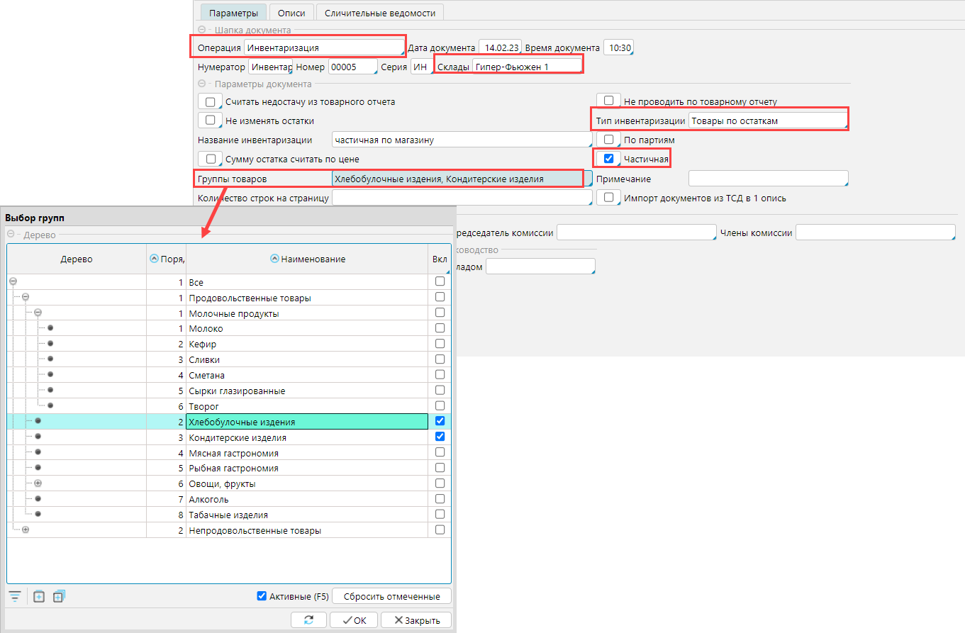 Частичная инвентаризация проводится только по выбранным группам товаров.