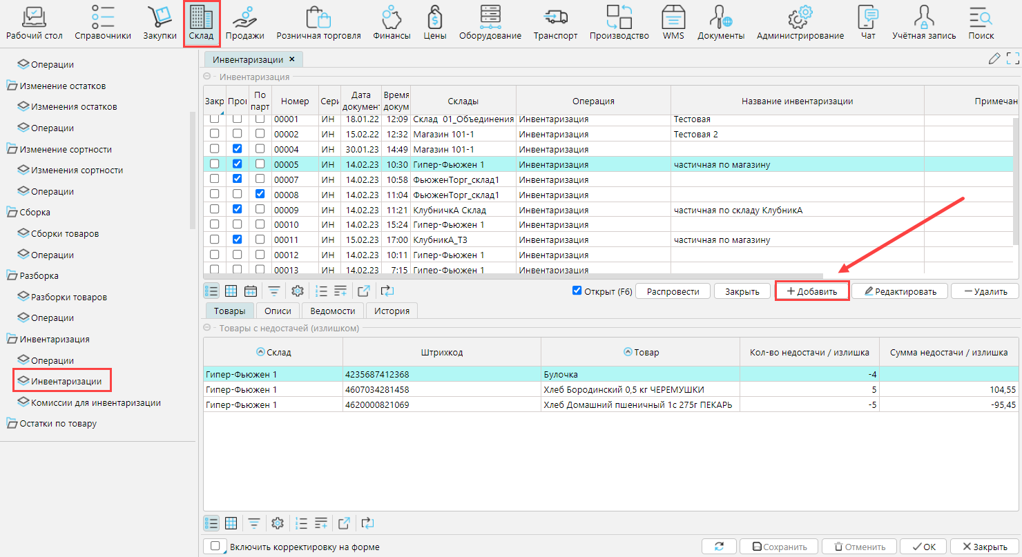 Чтобы провести частичную инвентаризацию необходимо на форме Склад - Инвентаризации создать новую инвентаризацию кнопкой Добавить.