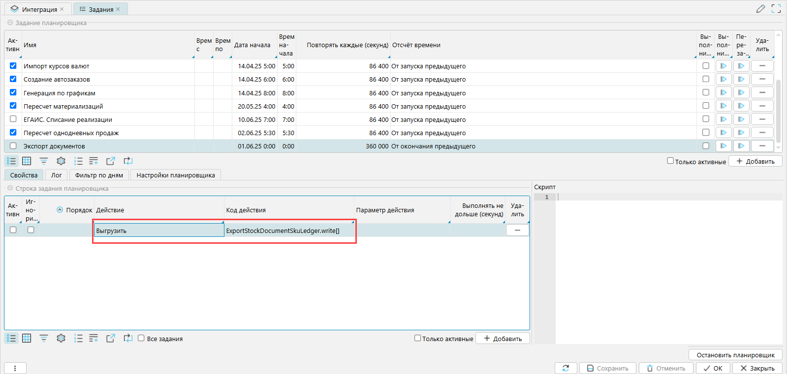 Можно настроить автоматическую выгрузку через Планировщик. Для этого необходимо настроить задание планировщика, в котором указать действие **Выгрузить (ExportStockDocumentSkuLedger.write[]) **(рис. 2).