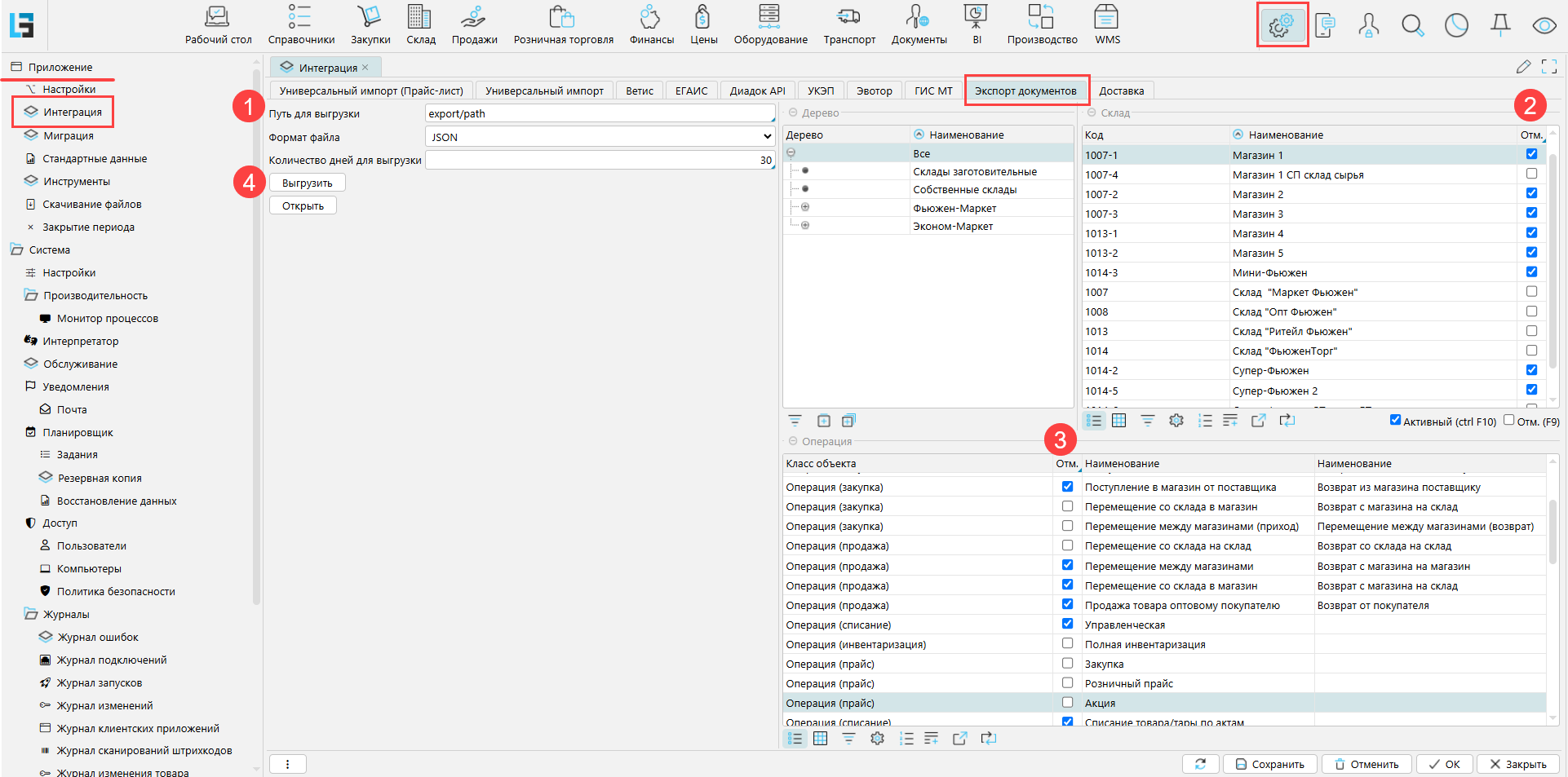 На форме Администрирование - Приложение - Интеграция на вкладке Экспорт документов (рис.1) производится и настройка параметров экспорта, и непосредственно выгрузка документов. Для этого сделайте следующее: